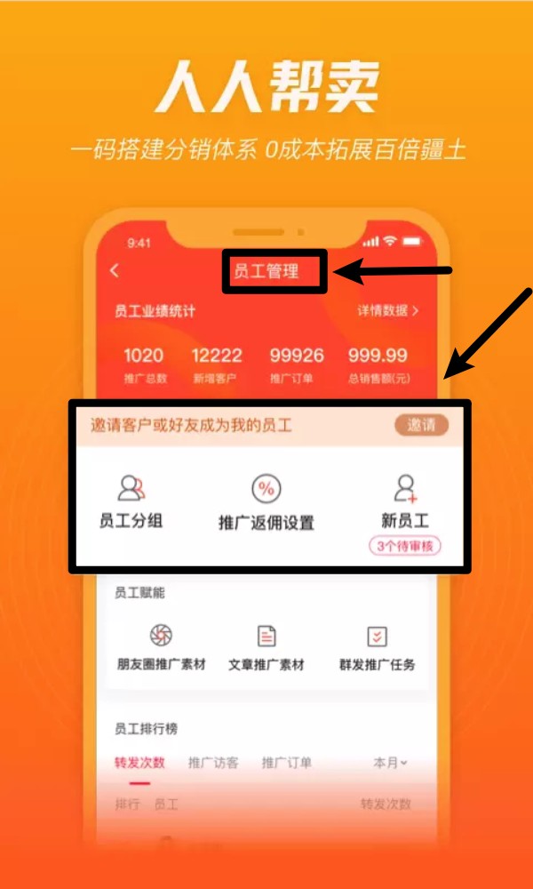 4. 切换至“员工管理”模块,可邀请好友成为分销员,并设置推广返佣比例,方便快速组建团队。