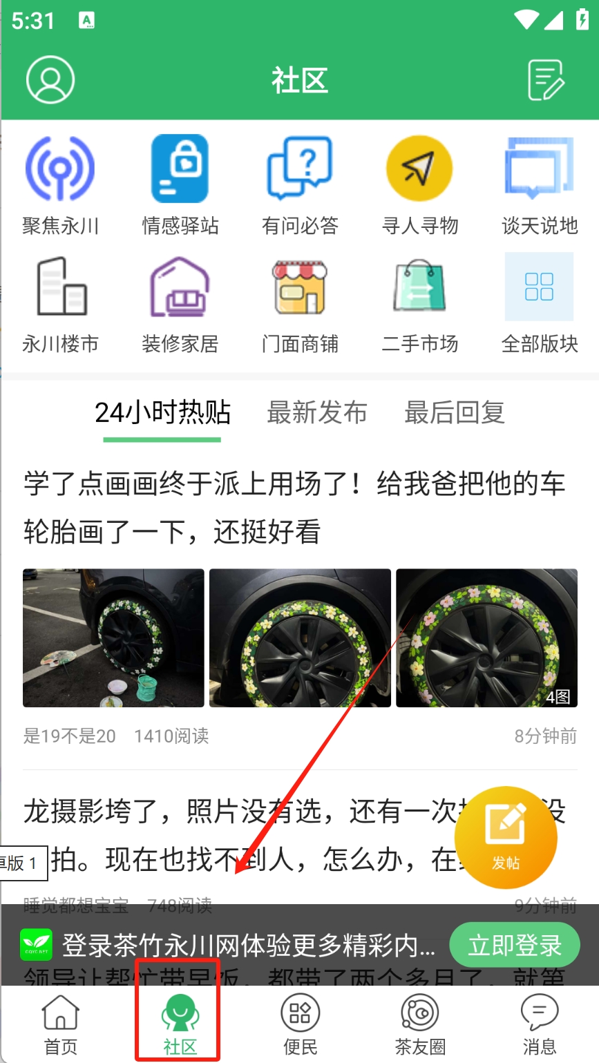 2、在社区页面,浏览“24小时热帖”中的热门话题,参与讨论或发布新帖
