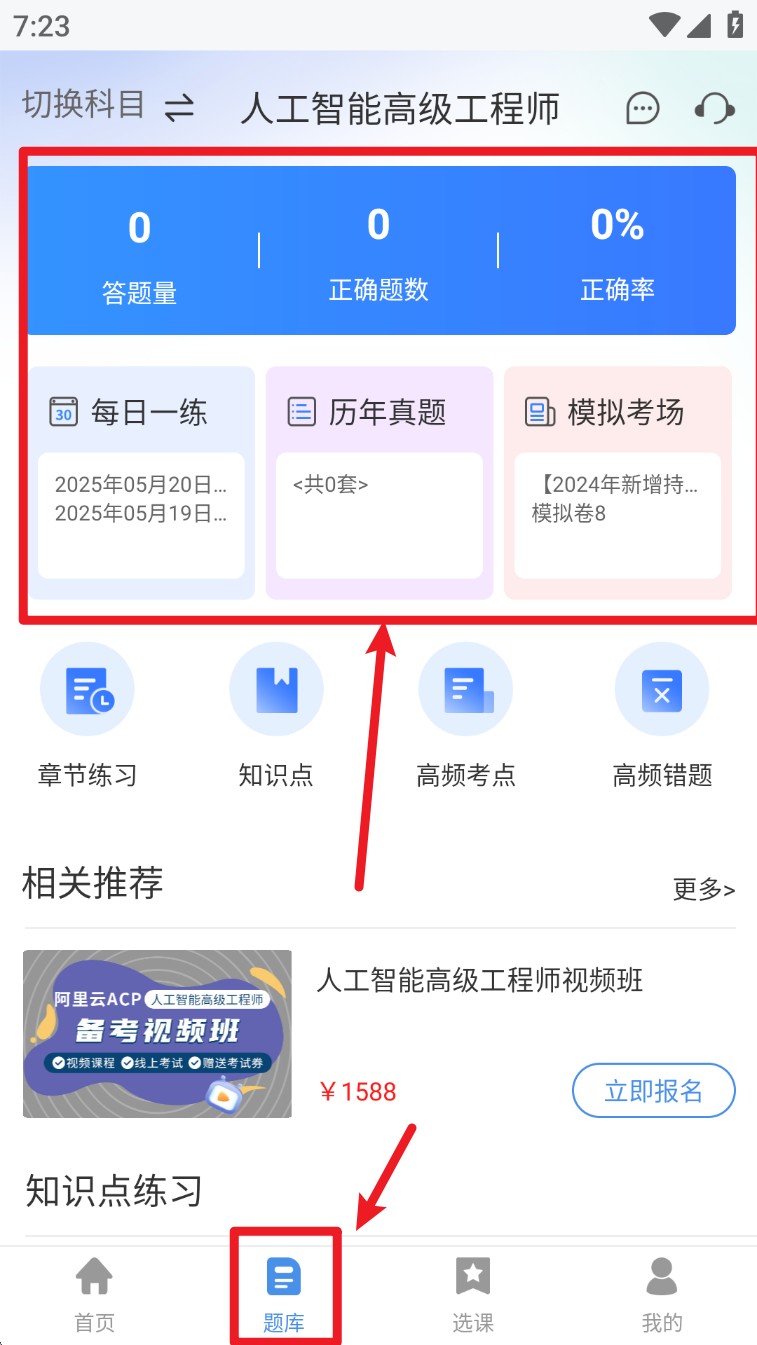 5. 点击底部“题库”进入刷题区,可进行每日一练、历年真题和模拟考场等练习操作。
