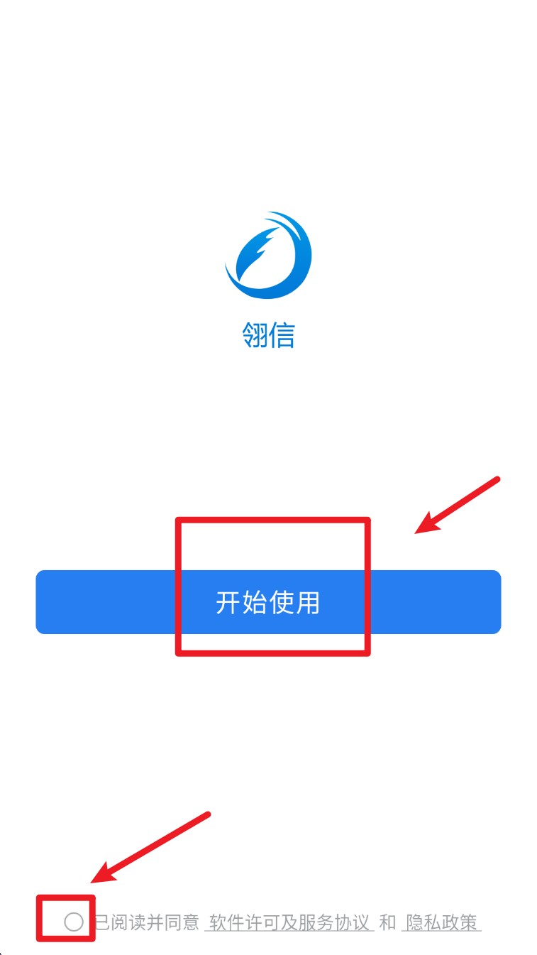 1. 打开翎信app,勾选下方协议选项后点击“开始使用”,进入应用初始化页面。