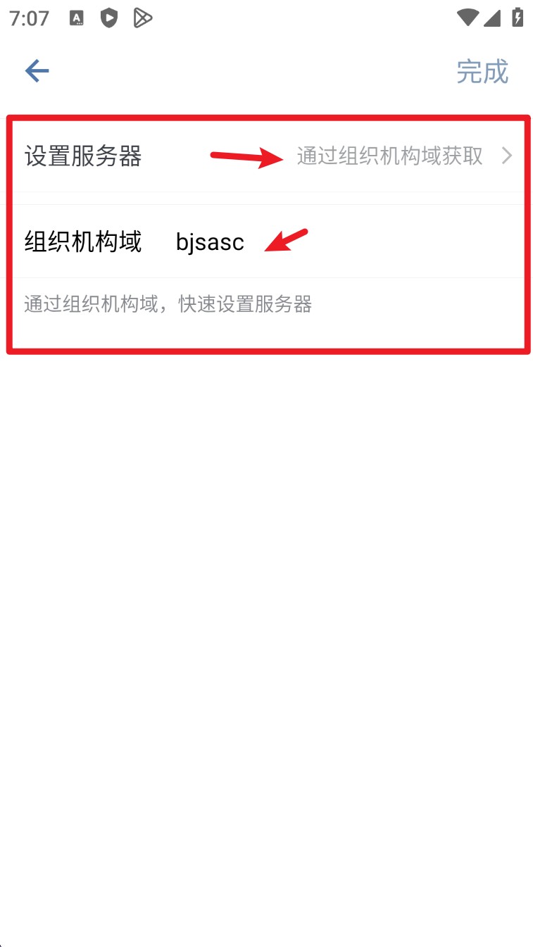 2. 在“设置服务器”界面输入组织机构域名,例如 bjsasc,自动获取并完成服务器配置。