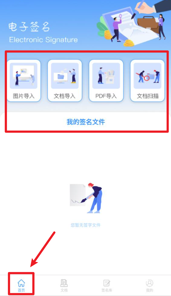 2. 登入成功后进入首页,点击图片导入、文档导入或 PDF 导入开始制作签名文件。