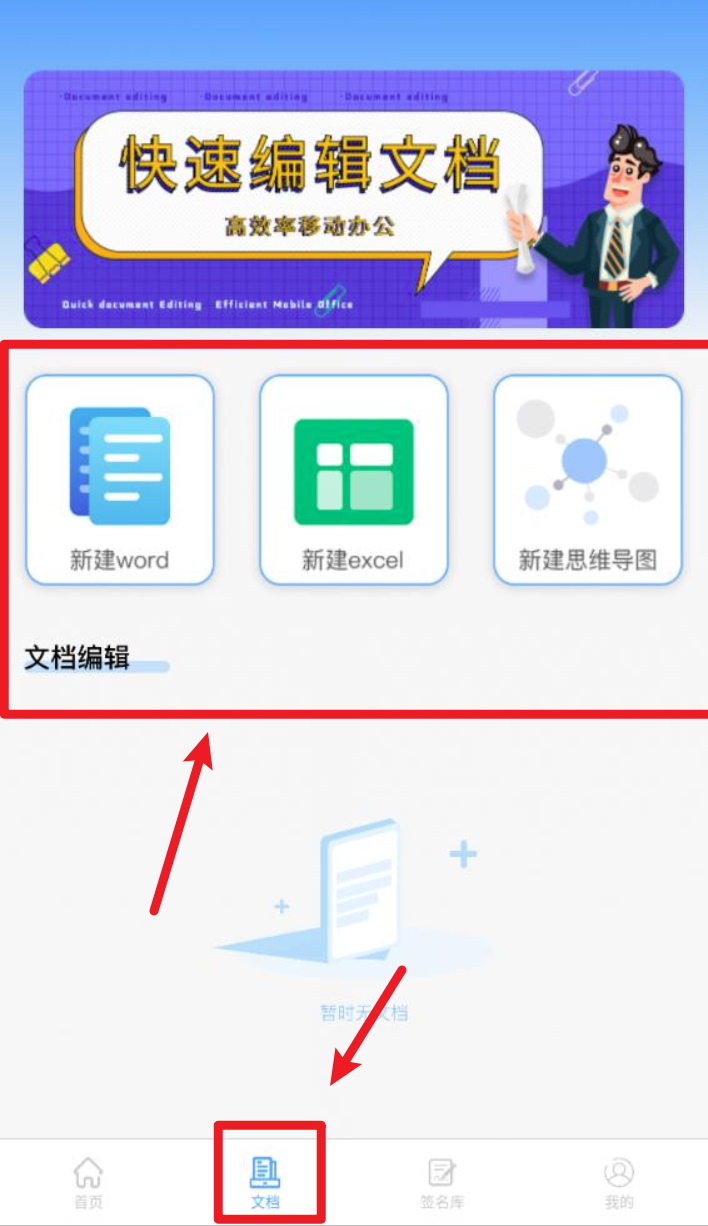 3. 切换到底部“文档”页签,可新建 Word、Excel、思维导图等编辑文档进行签名作业。
