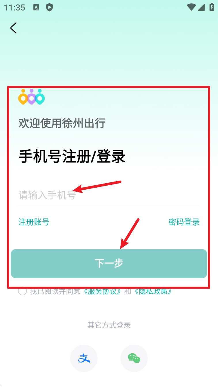 1. 打开 App 后进入登录界面,输入手机号点击“下一步”,选择短信登录或密码登录方式。