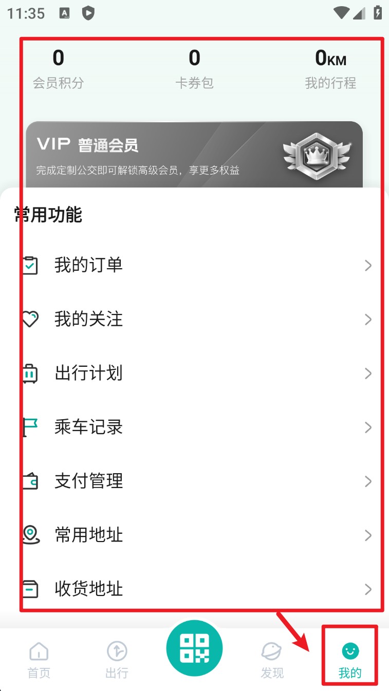 4. 在“我的”页面中可查看订单、关注列表、出行计划、乘车记录等常用功能。