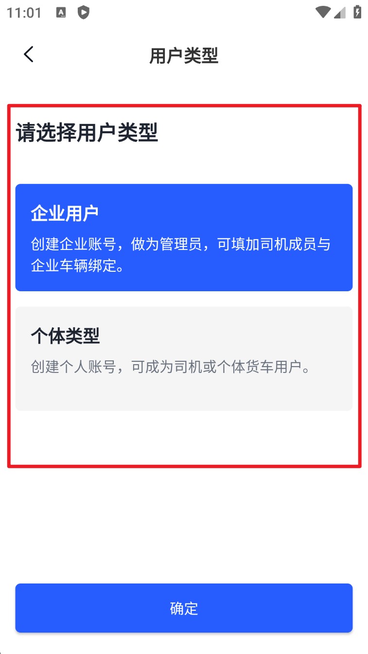 1. 进入沧港智管平台后,首先选择用户类型,企业用户可添加成员与车辆,个人用户适合司机注册。