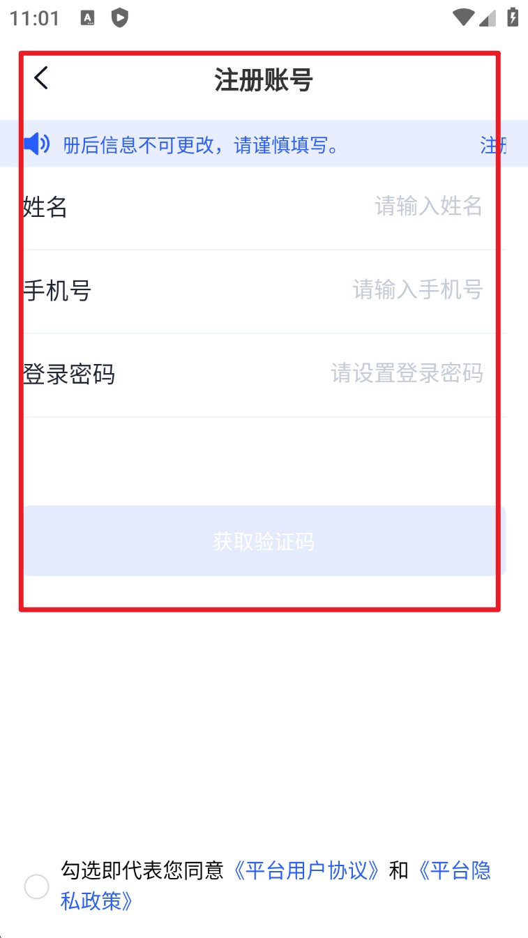 2. 选择类型后进入注册页面,填写姓名、手机号、密码等信息,并点击获取验证码完成注册流程。