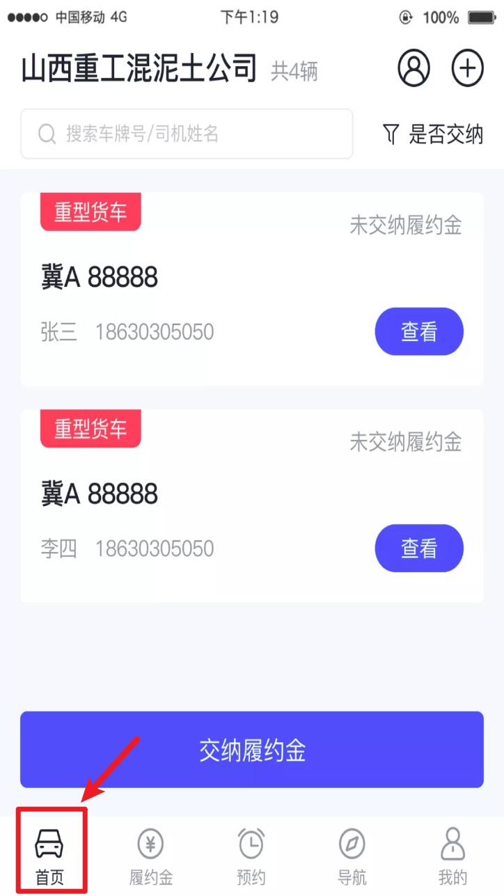 4. 登录后进入首页,可查看车辆列表与缴纳履约金状态,点击按钮可补缴对应车辆款项。