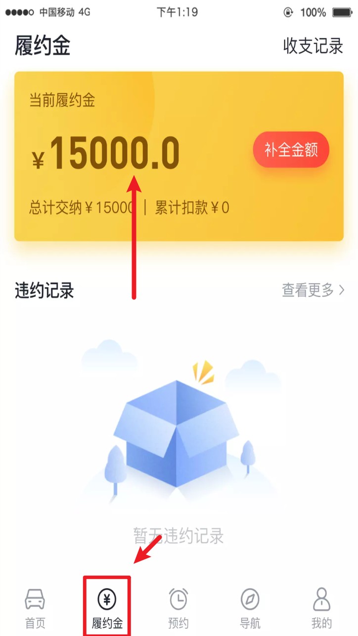 5. 点击底部菜单栏的“履约金”,可查看总交纳金额与扣款情况,还支持查阅历史记录。