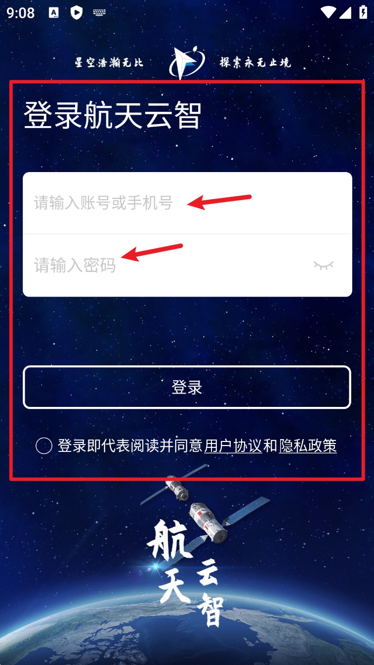 1. 打开 App,输入账号或手机号及密码,勾选用户协议后点击「登录」进入系统首页。