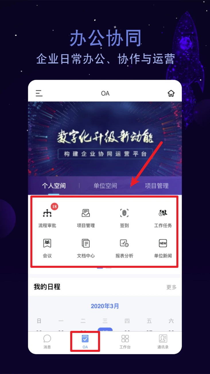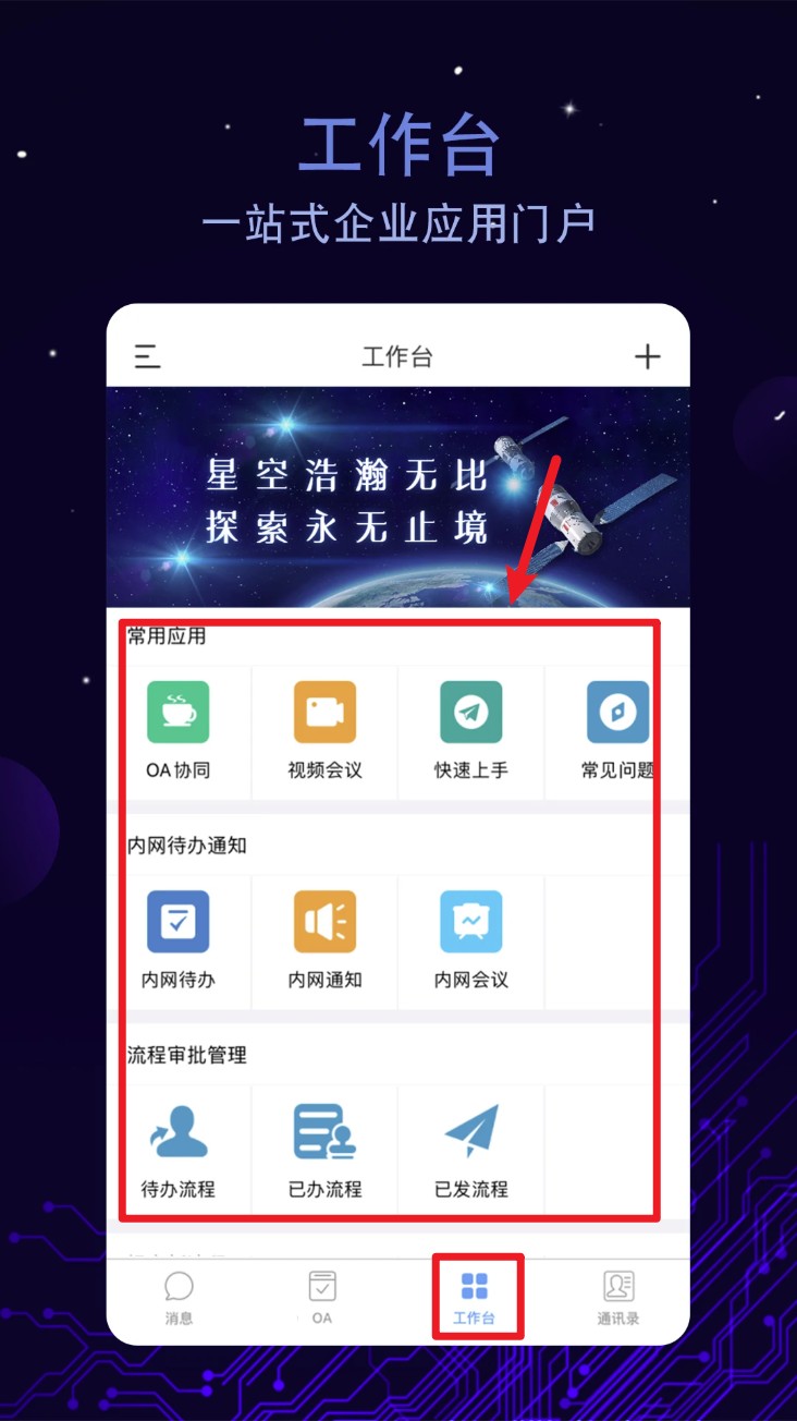 3. 在工作台内选择需要操作的功能模块,如「视频会议」「OA协同」或「内部通知」。