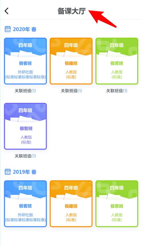 1、进入“备课大厅”可查看不同年级及班型的教学资料并进行相关备课。