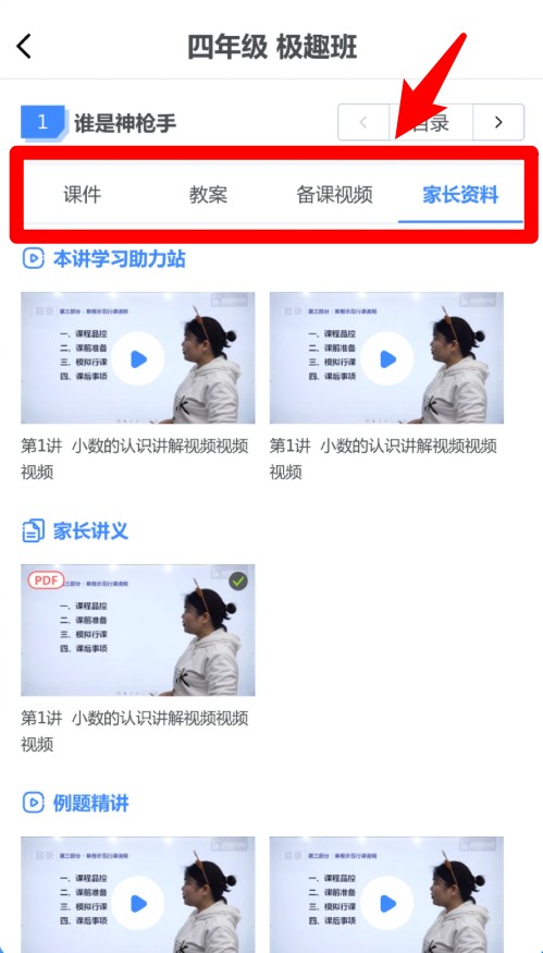 2、点击班级进入后,可在顶部切换课件、教案、视频与家长资料等栏目。