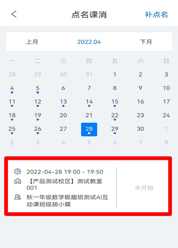 点名课消:老师可以查看自己的排课日历并进行点名。
