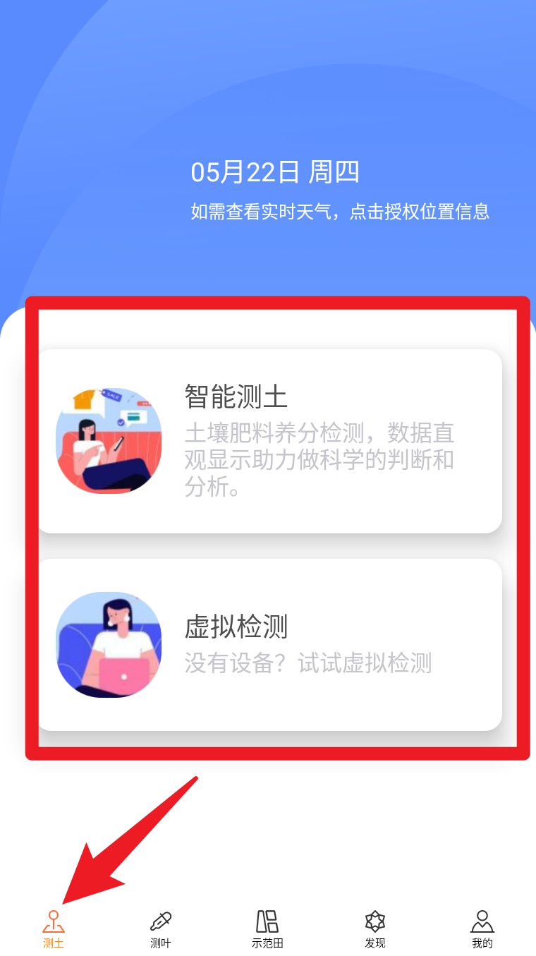 3. 登录后点击底部导航栏的“测土”,可进入“智能测土”或“虚拟检测”模式。