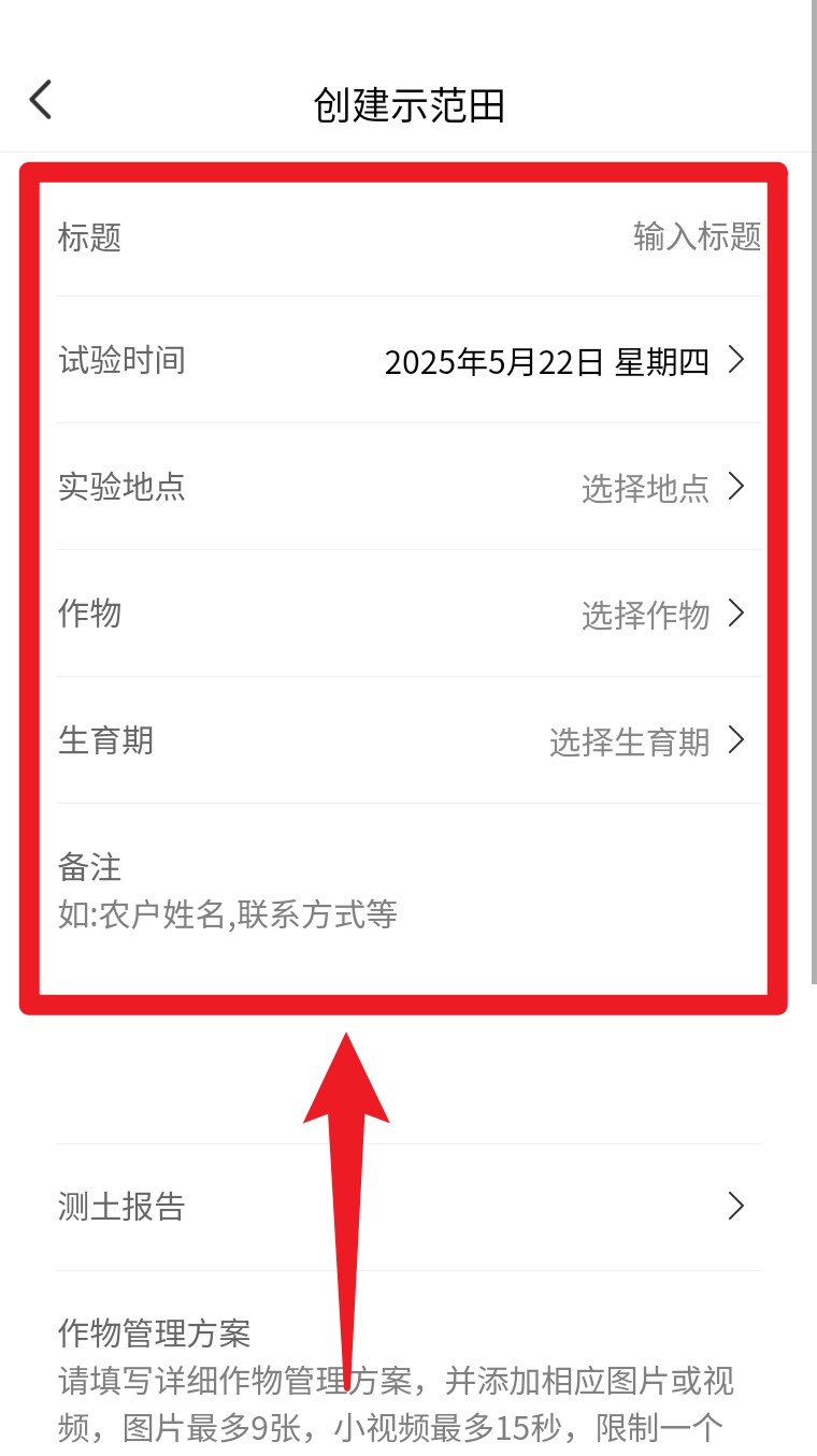 5. 填写示范田的标题、地点、作物与备注信息,完成后提交即可开始作物管理。