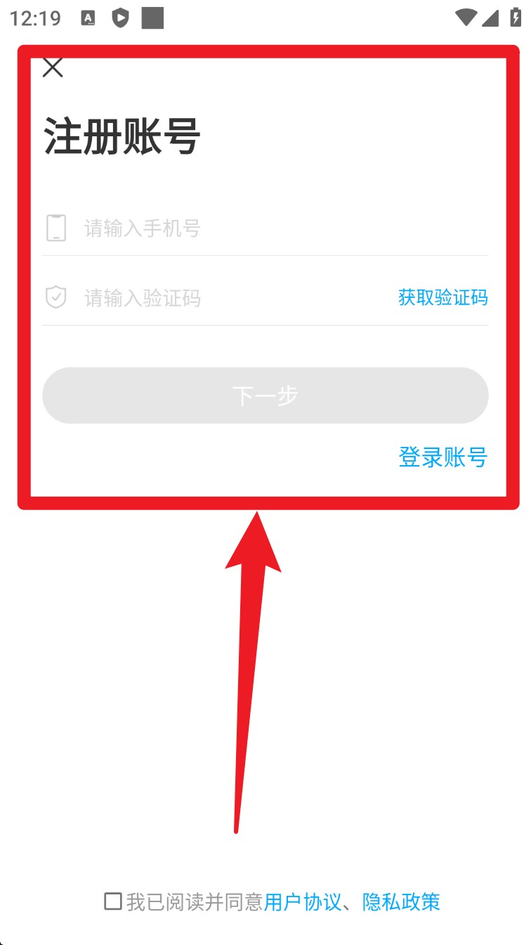 1. 打开 App 后进入注册页面,填写手机号与验证码,勾选协议并点击「下一步」完成账号注册。