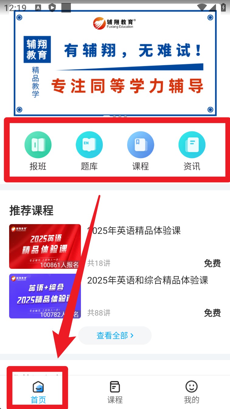 4. 在首页页面点击顶部功能入口,可快速进入“报班”“题库”“课程”“资讯”等主要模块。