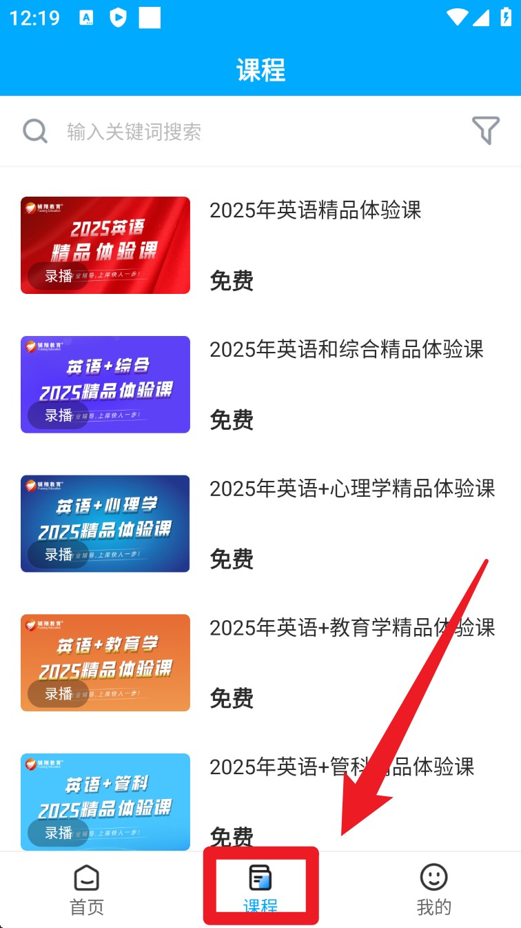 5. 切换至「课程」页签,浏览并选择免费体验课程,点击课程封面即可进入学习界面。