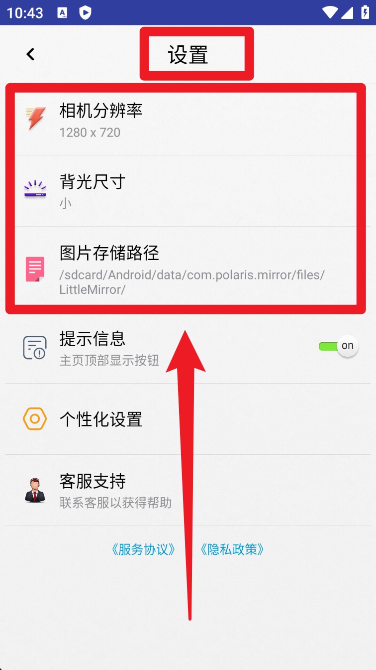 2. 进入设置页可调整相机分辨率、背光尺寸及图片保存路径,确保成像效果符合个人需求。