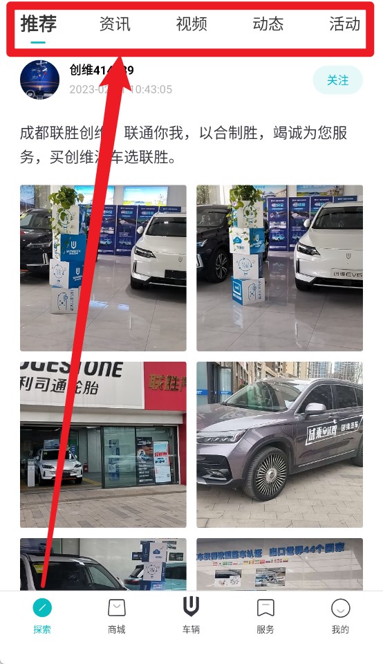1、点击“探索”页面查看推荐资讯内容,浏览视频动态更新。