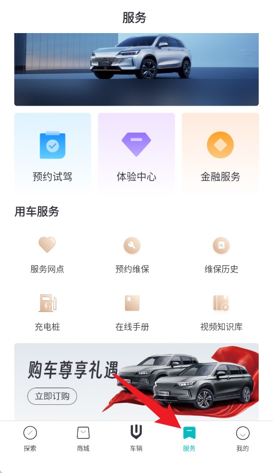 4、打开“服务”页面可预约试驾,查看维修及充电服务项。