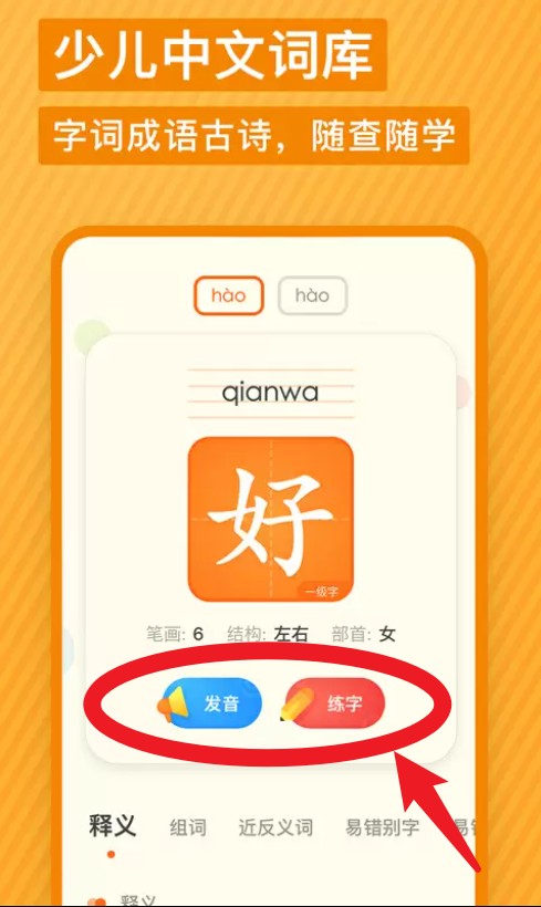汉字笔顺:汉字全部配置笔顺动图及跟写练习,并为每一个汉字录入真人发音,为儿童带来多感官学习体验。