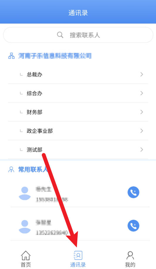 2、点击底部“通讯录”按钮,查看和搜索公司通讯录。