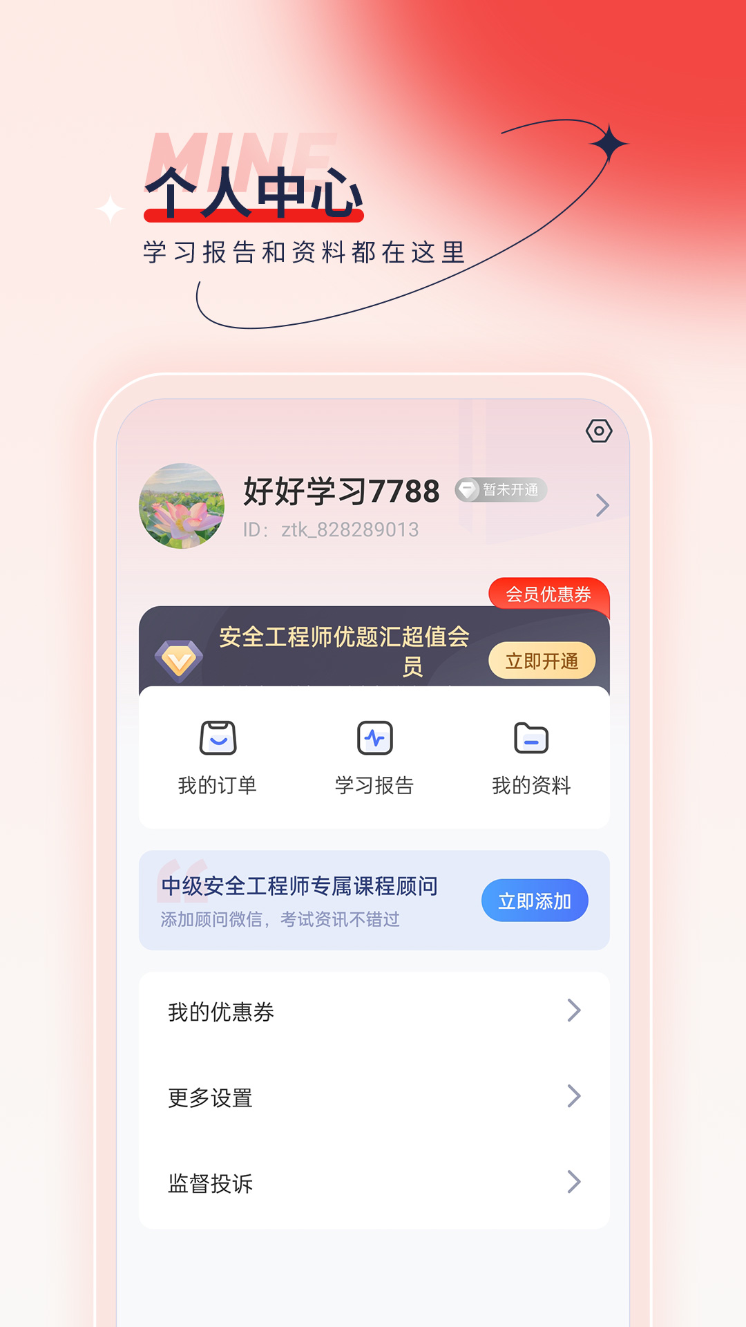 4.个人中心可查看订单、学习报告与资料管理,便捷实用。