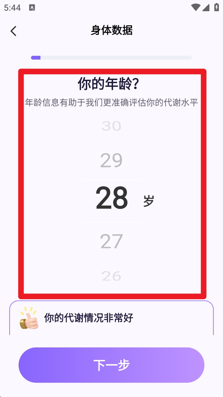 2. 接着填写年龄信息,系统会据此评估代谢水平,生成适合你的热量与运动目标参数。