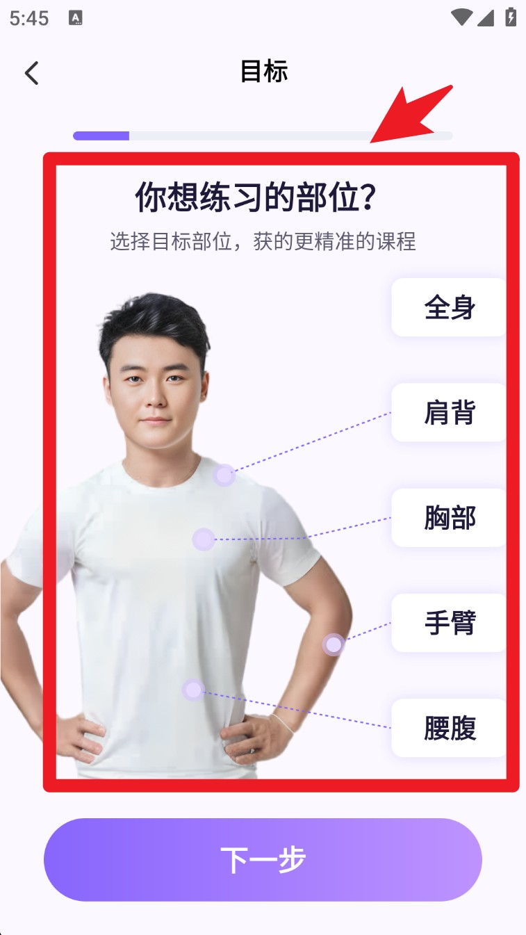 3. 在目标设置页面选择你想锻炼的部位,如全身、腰腹、肩背等,课程内容将精准定制。