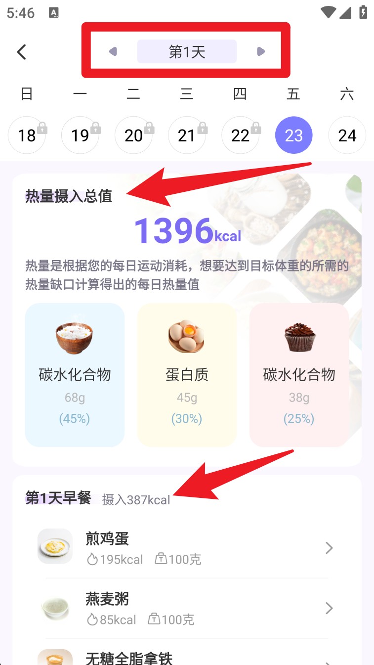 5. 进入每日任务模块,查看当天热量建议和餐食摄入记录,按食谱建议合理搭配每一餐。