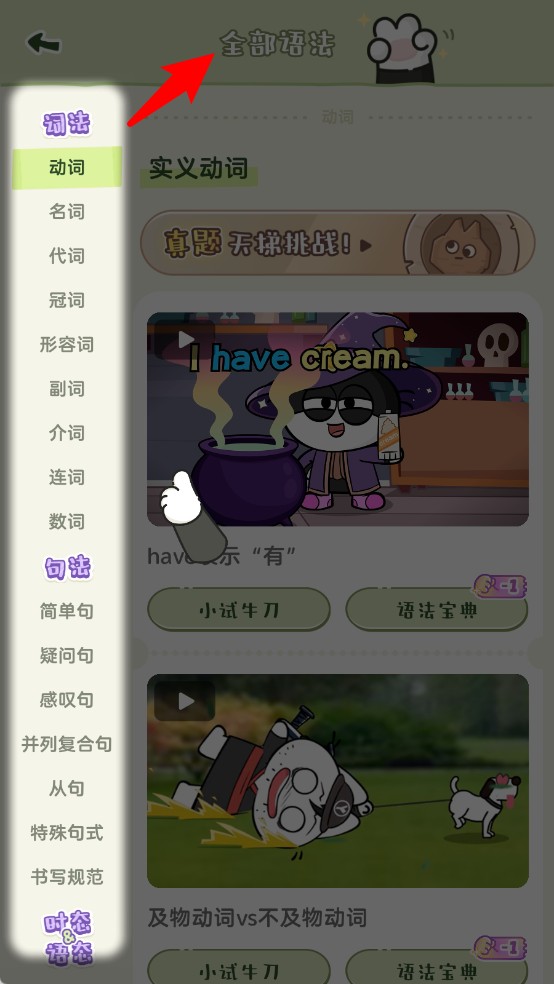 3、点击左上“全部语法”,可选择学习词性、句型等语法分类。