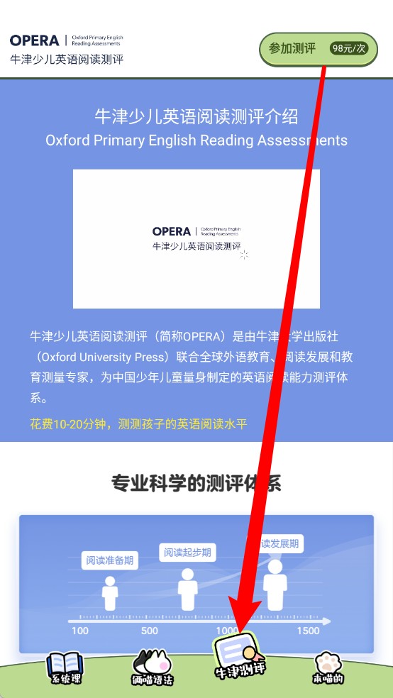 4、点击底部“牛津测评”,可付费参与专业少儿英语阅读测评。
