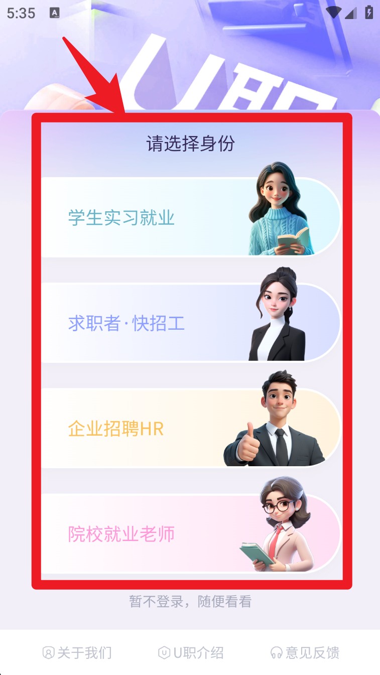 1. 打开U职招聘APP后,先选择自己的身份类型,例如学生、求职者或HR,系统将根据角色定制首页内容。