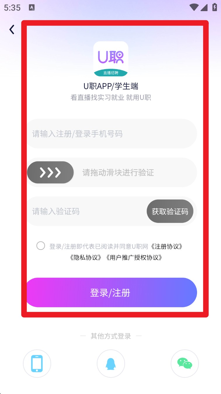 2. 进入对应端口后,输入手机号并通过滑块验证,填写验证码后点击「登录/注册」即可进入系统。
