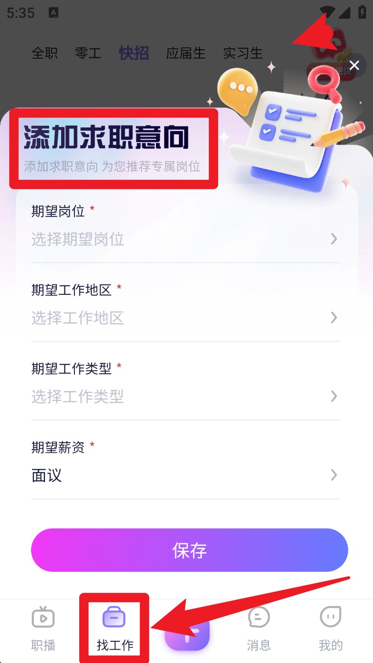 3. 在首页点击底部导航栏的「找工作」,系统会引导你填写求职意向,如岗位、地区、类型和薪资。