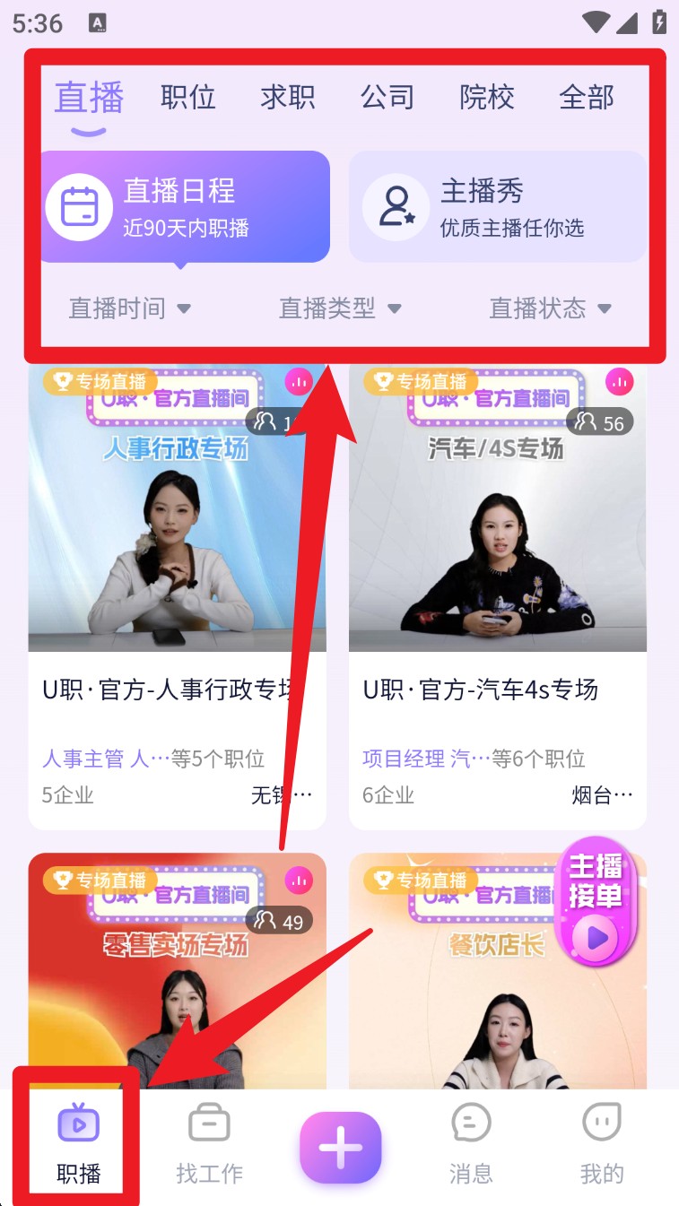 5. 若想了解企业招聘动态,可切换至「职播」页面,进入正在进行的岗位直播专场,边看边互动。