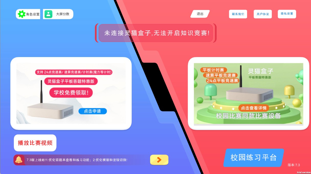 1、首页提示需连接灵猫盒子才能开启校园知识竞赛功能。
