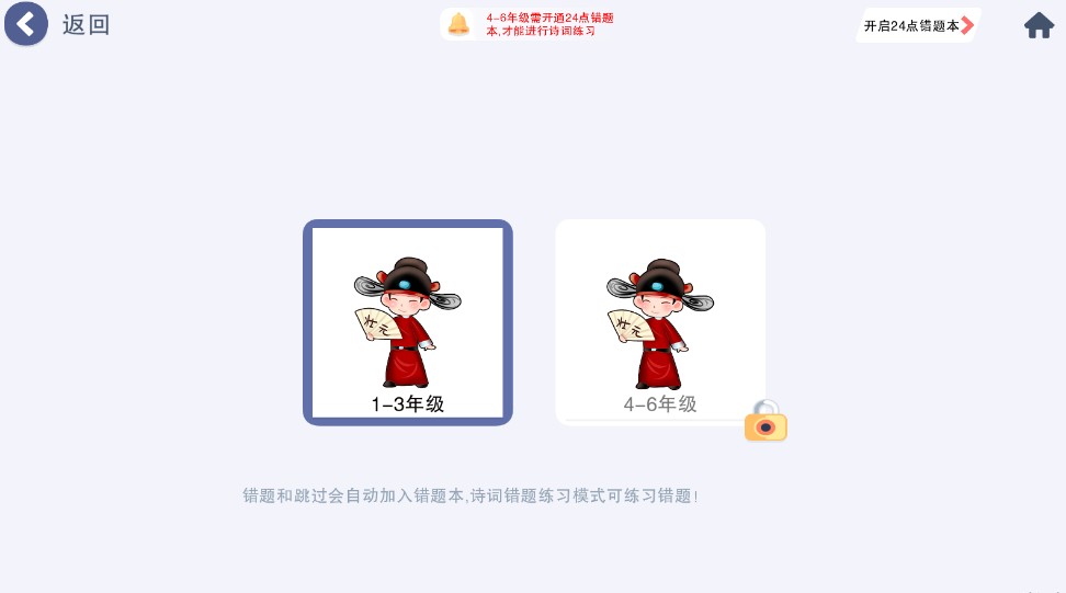 4、选择诗词挑战的年级段后可进行错题练习模式答题。