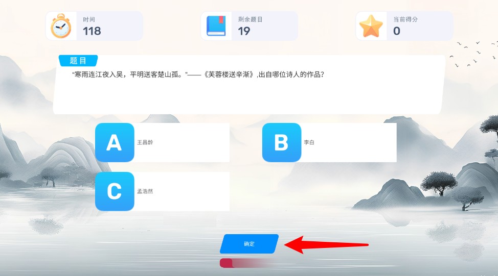 5、诗词挑战题目提供选项作答,选择后点击“确定”提交。