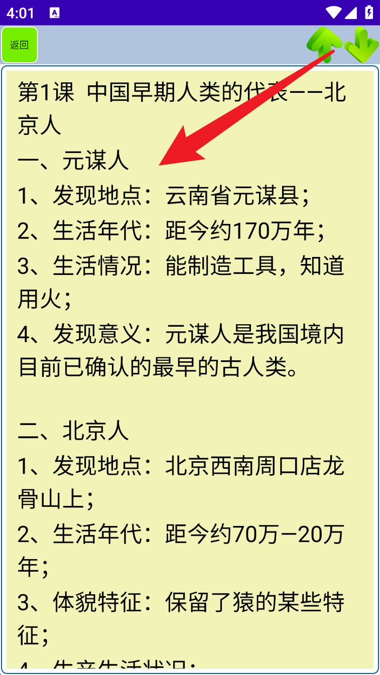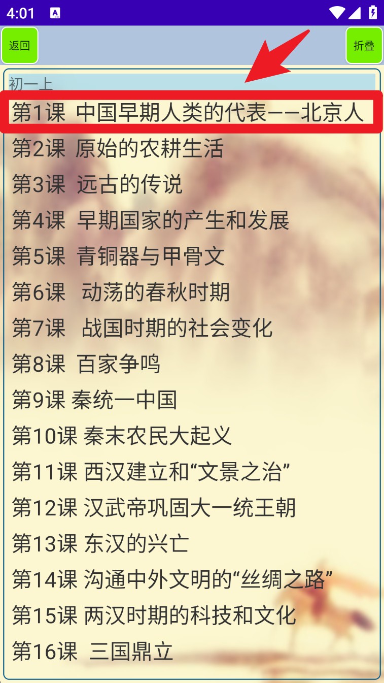 2. 在目录中点选任一课标题,例如「第1课 中国早期人类的代表——北京人」,展开对应知识笔记。