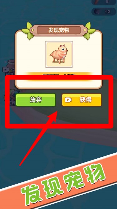 3.二选一互动选项:玩家可以选择【放弃】或【获得】该宠物,获得条件可能需观看广告影片,是典型的“抽中加互动式领取”设计。