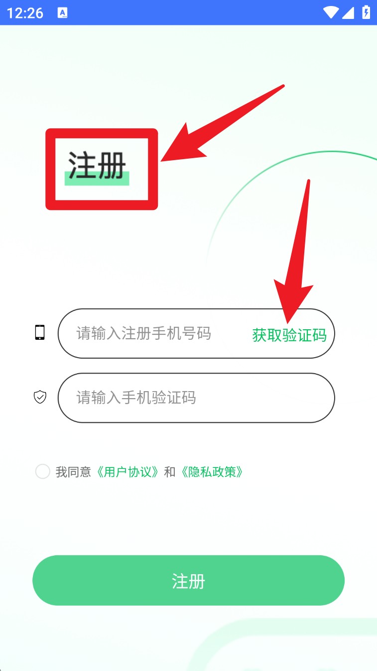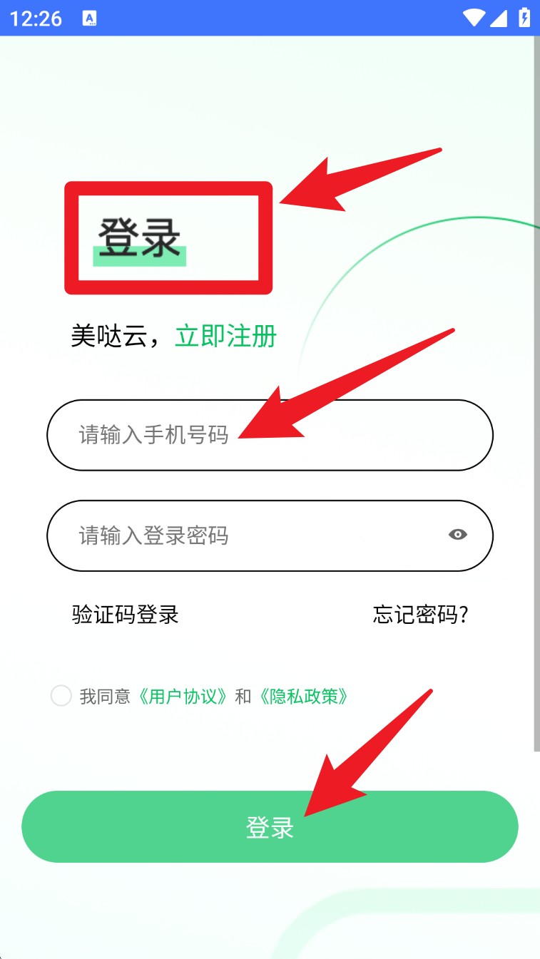 1. 打开美哒云 App,进入首页点击“注册”按钮,填写手机号与验证码,勾选协议后点击底部按钮完成注册。