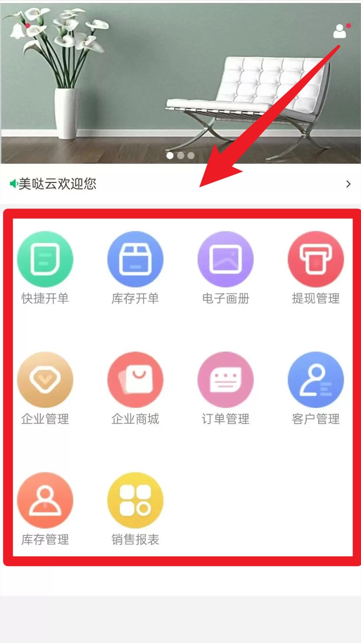 3. 登录后会进入主界面,点击首页图标可快速访问开单、订单、客户、库存等常用模块。