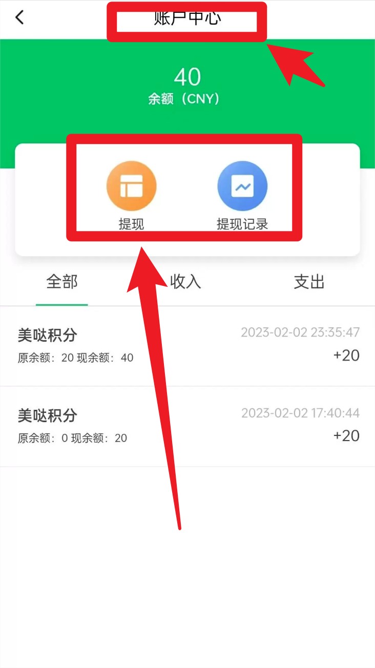 5. 进入“账户中心”后可查看余额与积分,点击“提现”按钮发起转账请求,也可查阅历史记录。