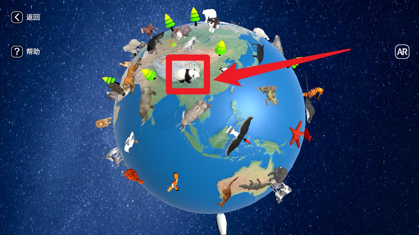 2. 选择“AR地球仪”后,系统会引导你进入动物百科区域,点击图标即可查看对应动物的三维模型。