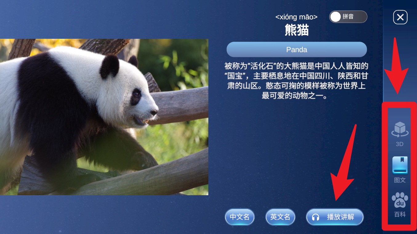 5. 若要进一步学习,可使用页面右侧功能栏切换图文信息、查看百科资料或启动立体展示效果。