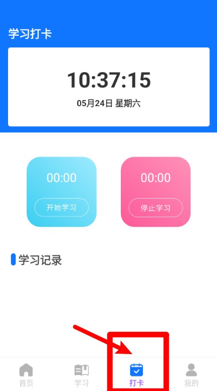 2.学习打卡:打开APP,定位到底部菜单栏中间的“打卡”按钮,一点进去就是学习打卡主界面。