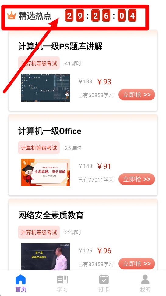 4.限时推荐:「精选热点」是限时推荐内容,带有倒计时,千万别错过热门课程和优惠活动。